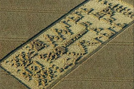 One year earlier, just yards from the Chilbolton Observatory, two formations appeared—one of a human-like face, and the other a rectangular pattern that mirrored the original Arecibo message sent into space in 1974.